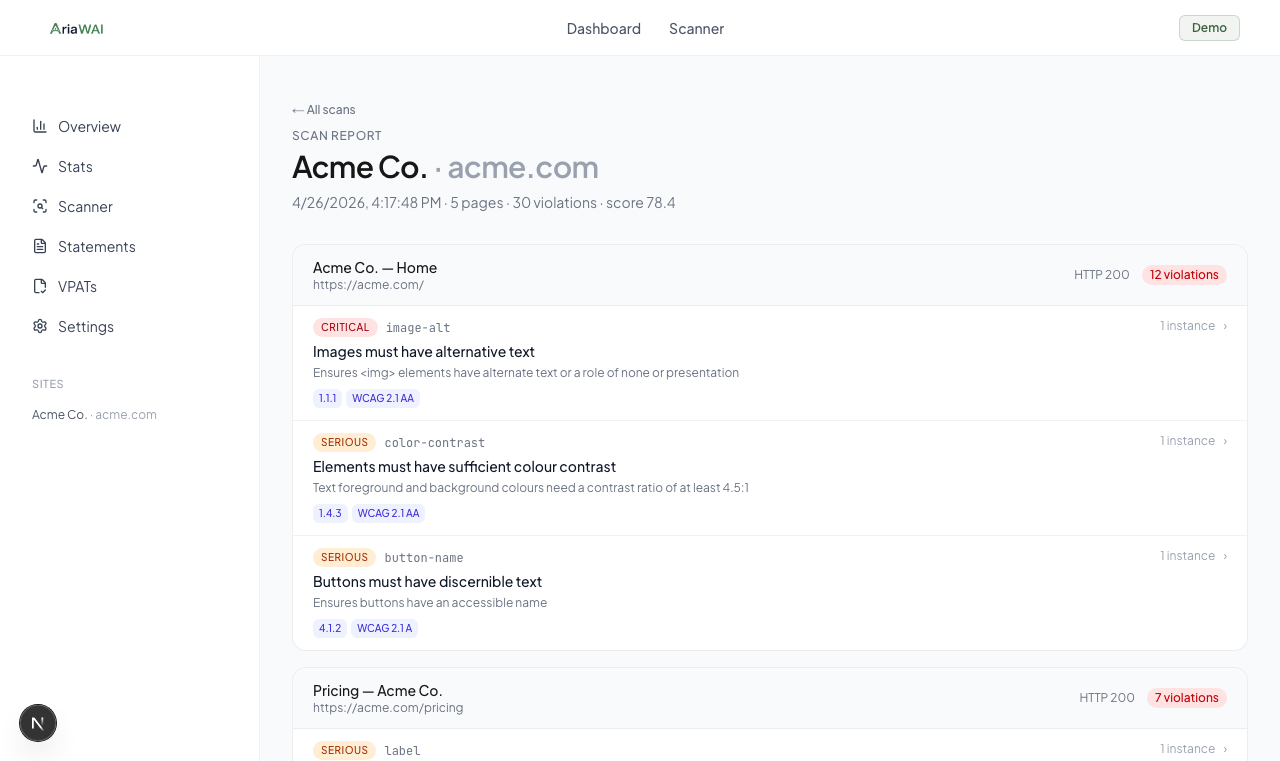 - Differentiator: refuses to claim overlays deliver compliance, ships a real WCAG scan instead