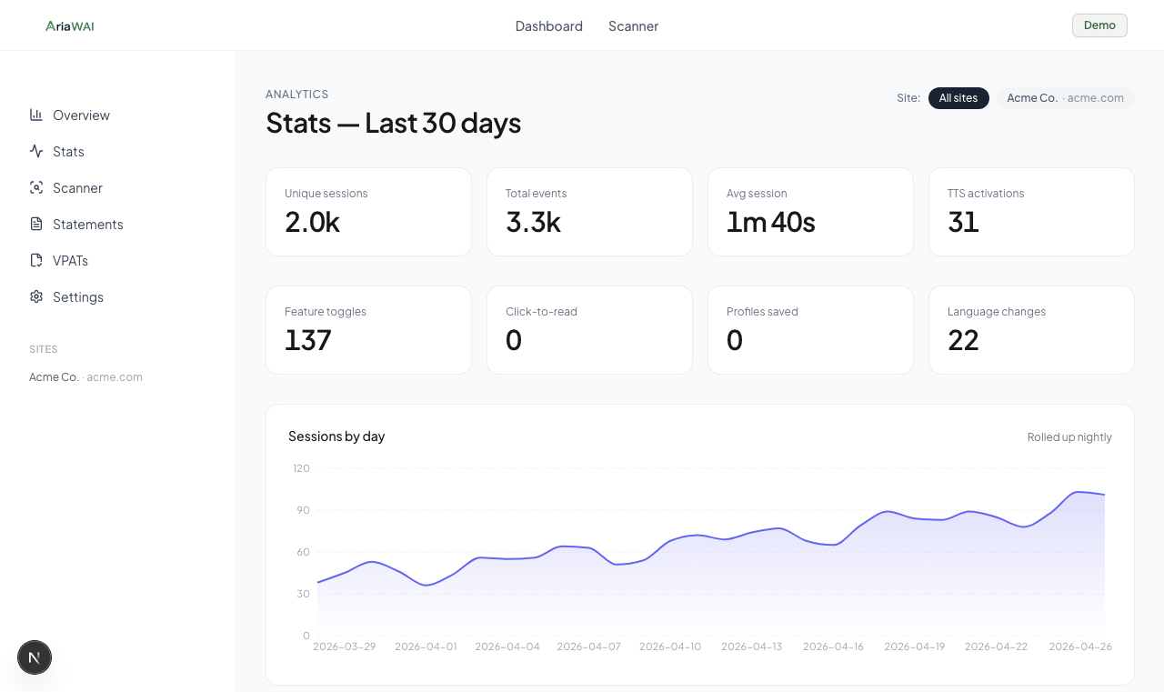 AriaWAI is an embeddable accessibility widget that gives every visitor real controls over font size, contrast, dyslexia fonts, text-to-speech, and ten other settings. Unlike legacy overlay vendors, AriaWAI does not claim to deliver WCAG or ADA compliance, because no overlay can. Instead, it pairs the widget with a built-in scan that lists the actual accessibility issues in your markup and a VPAT generator on the Pro plan. AriaWAI is feature-equivalent to the leading overlay products at roughly one tenth of the price, hosted in the European Union, and designed for agencies and small teams who would rather fix accessibility than market it.