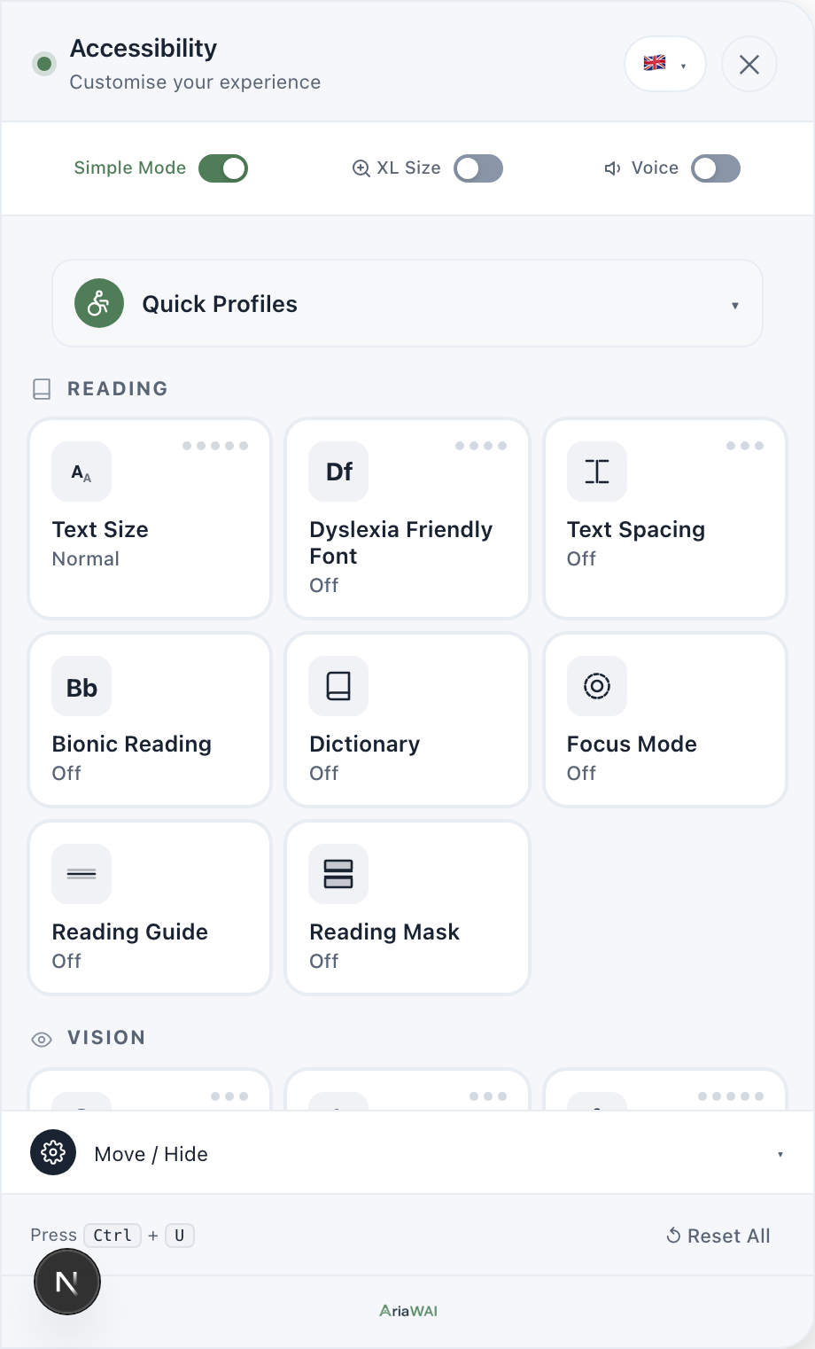 AriaWAI is an honest accessibility toolbar for any website. One script tag, fourteen visitor controls, and a built-in WCAG scan. No compliance theatre.
